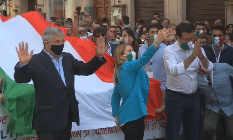 Las principales fuerzas de oposición de derecha y centroderecha italiana marcharon este martes en Roma, y más de 60 ciudades de todo el país para exigirle al Ejecutivo que otorgue "más liquidez" a trabajadores y empresas golpeadas por la pandemia.