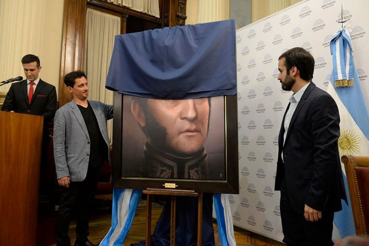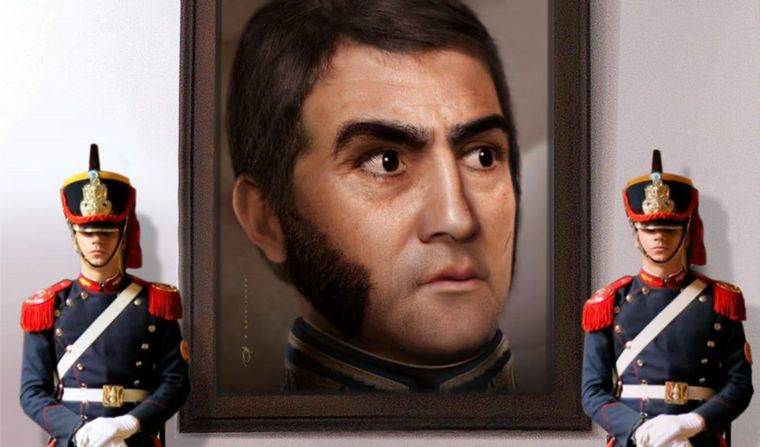 "Estábamos mirando retratos y no encontrábamos uno exacto. Entre los que existen, hay muchas diferencias. Empecé a repasar su retrato más famoso que es el que sale con la bandera. Yo sabía que había sido pintado por la profesora de Mercedes, su hija, y por él mismo. Ese retrato lo tuvo en su habitación hasta su último día. Se sentía bien identificado con esa imagen", dijo a Cadena 3 el artista.
