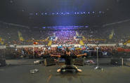 Subió al escenario pasadas las 23.30, apareció por una escalera, al tope con el techo del escenario para cantar ante un público que explotaba.