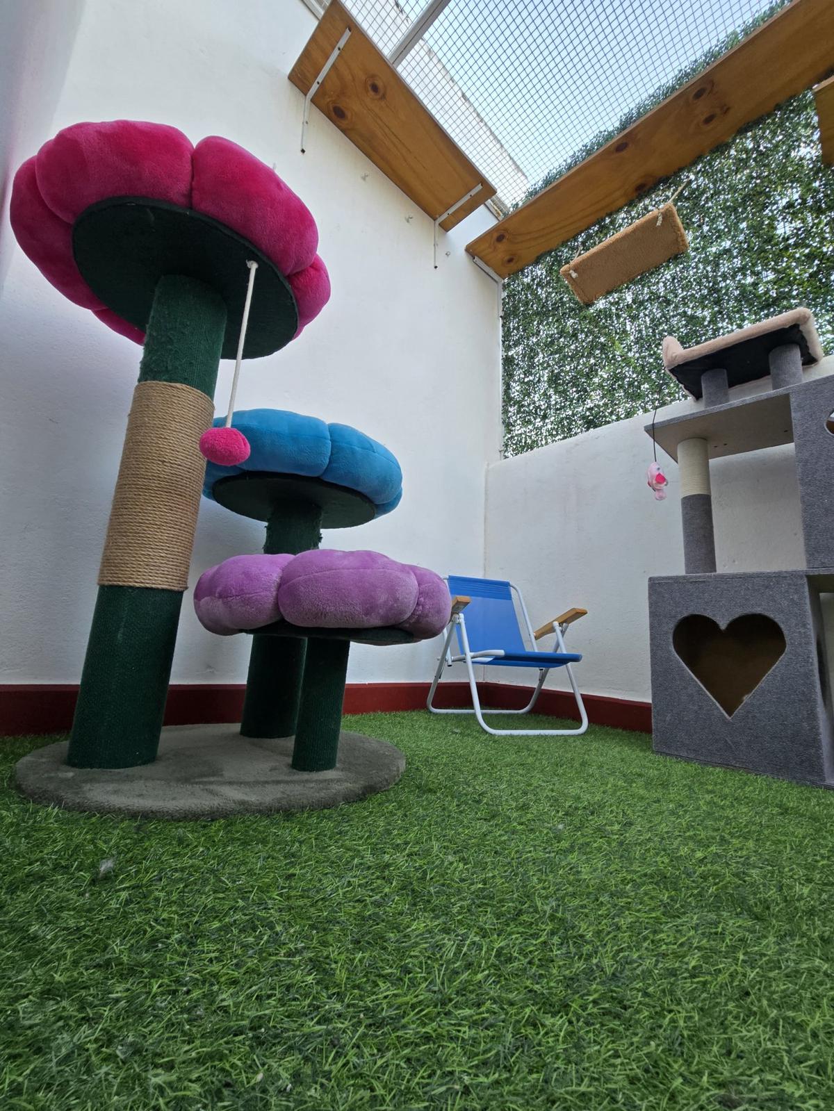 Virginia comenzó en su propio departamento, recibiendo gatos en su casa: “La primera inversión fue poner seguridad en las ventanas y el balcón. No tenía juguetes, ni bandejas, ni platos. Empecé con nada, con nada, con nada… como quien dice, con las uñas”. Hoy, la guardería funciona en un departamento aparte, exclusivo para los gatos. “Yo vivo en otro lugar. Ellos tienen su espacio para estar tranquilos y recrearse”, detalla.