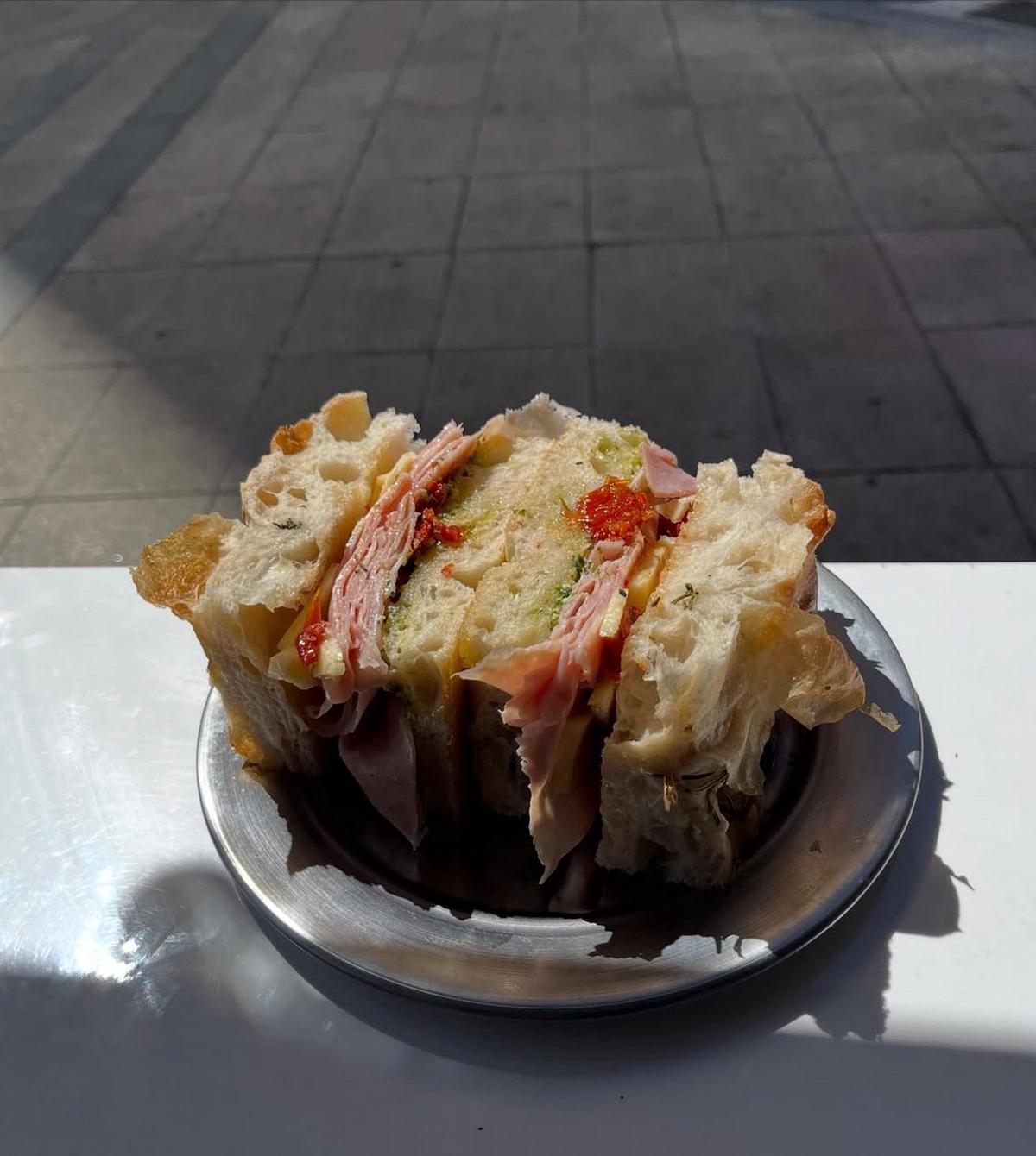 Consciente del tamaño del local, Marc decidió que la carta debía ser breve pero contundente. Cuatro variedades, todas con nombres de artistas italianos: Caravaggio, Vivaldi, Da Vinci y Giuseppe. “Busqué abarcar lo mayor posible con lo mínimo”, explica. Hay opciones vegetarianas, combinaciones clásicas con pesto y jamón cocido, y propuestas más elaboradas como mortadela con ricota y nuez. Cada focaccia cuesta 13.000 pesos y está pensada para compartir.