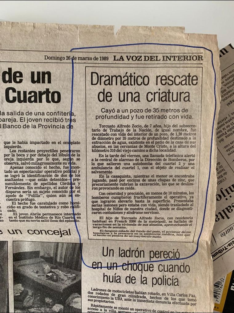 El 24 de marzo de 1989, Torcuato "Tino" Alfredo Sozio, un niño de 7 años, cayó en un pozo de 1,20 metros de diámetro y 35 metros de profundidad en un campo de Monte Cristo, Córdoba.