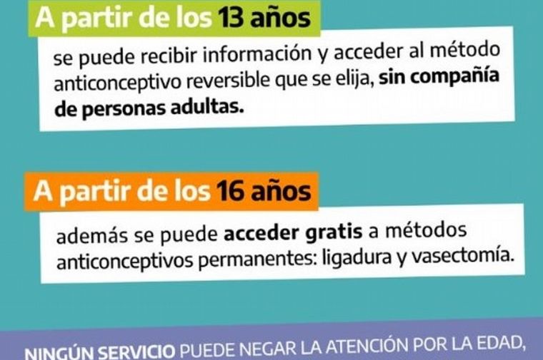 La publicación agrega que los jóvenes a partir de 16 años pueden acceder a métodos anticonceptivos permanentes, como la ligadura de trompas y la vasectomía. "Ningún servicio puede negar la atención por la edad, por no tener DNI o por ningún otro motivo".