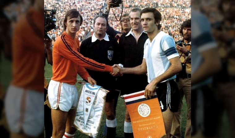 "El Mariscal" saluda a Johan Cruyff en la previa de un duelo contra Holanda.