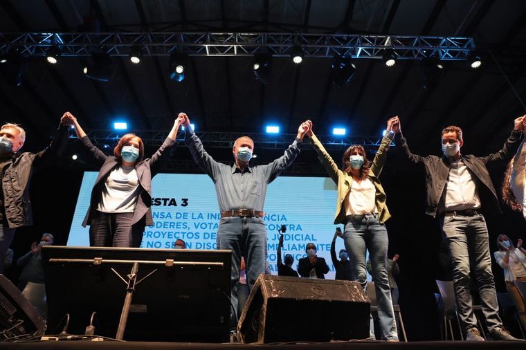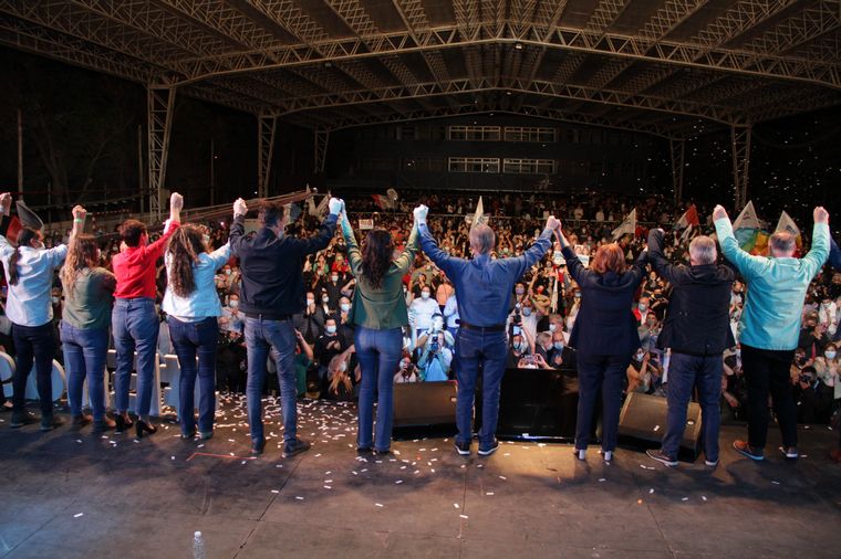 Los cuatro dirigentes antes mencionados hablaron en el mitin, el primero que se realizó con la presencia de militantes tras las últimas flexibilizaciones sanitarias.