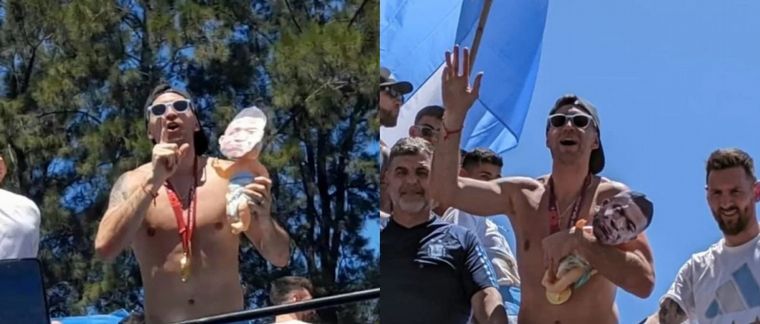 En un momento de la caravana, el "Dibu" Martínez recibió un muñeco con la cara de Mbappé, delantero del PSG, y se burló de él haciendo el gesto del dedo de silencio.