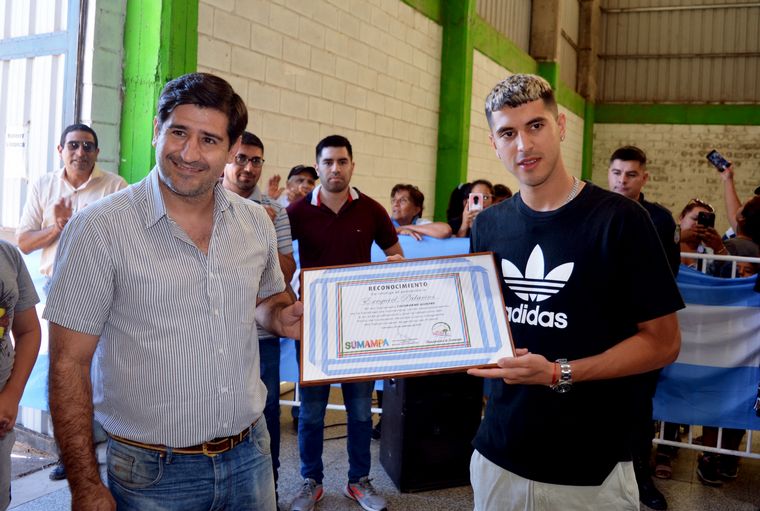 Justamente allí, en el Polideportivo, se llevó a cabo el acto de entrega de reconocimiento, se hizo el descubrimiento del mural realizado por el artista Ángel Taboada y el intendente anunció que este espacio deportivo llevará el nombre de Exequiel Palacios.