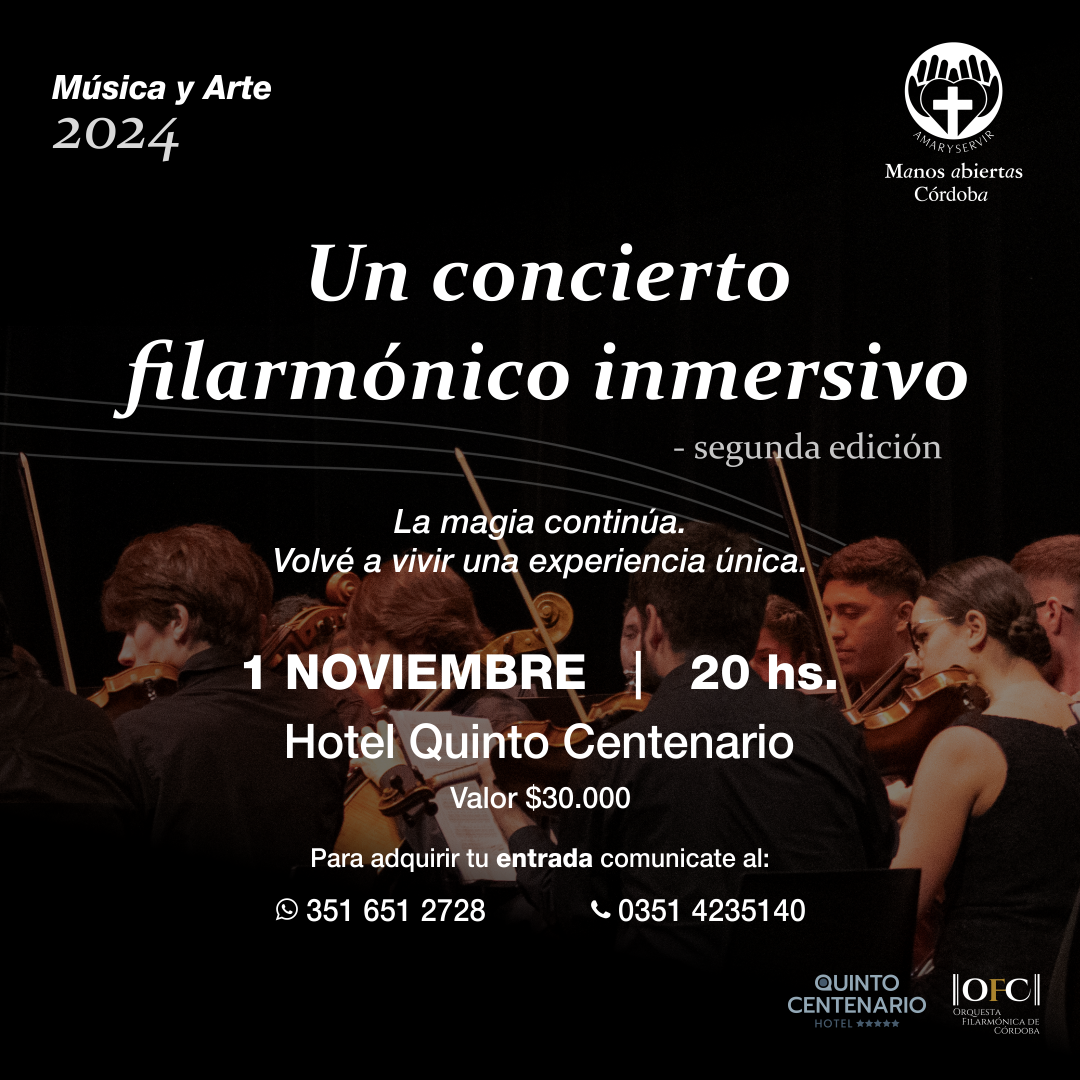 Con más de 23 años trabajando solidariamente, Manos Abiertas sigue comprometida con los más vulnerables a través de sus 12 obras y programas. Este concierto inmersivo promete transportar a los asistentes a un mundo de melodías y emociones, con la Orquesta Filarmónica de Córdoba en el centro del salón del emblemático Hotel Quinto Centenario.