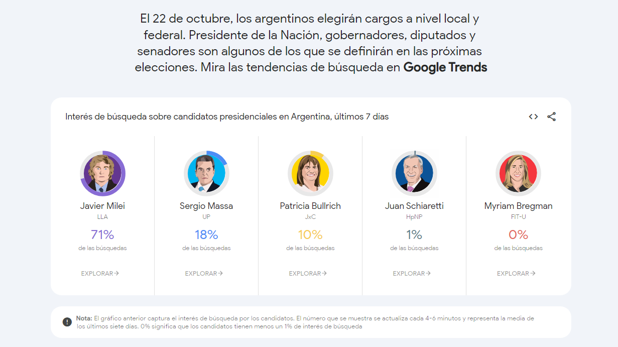 Por riguroso orden alfabético los que superaron el 1,5 % requerido son Myriam Bregman, Patricia Bullrich, Sergio Massa, Javier Milei y Juan Schiaretti, nombres que a lo largo de una jornada son googleados miles de veces por gente que, al parecer, quiere conocer datos que los medios omiten o que están perdidos en el fárrago de información sobre actos proselitistas.
