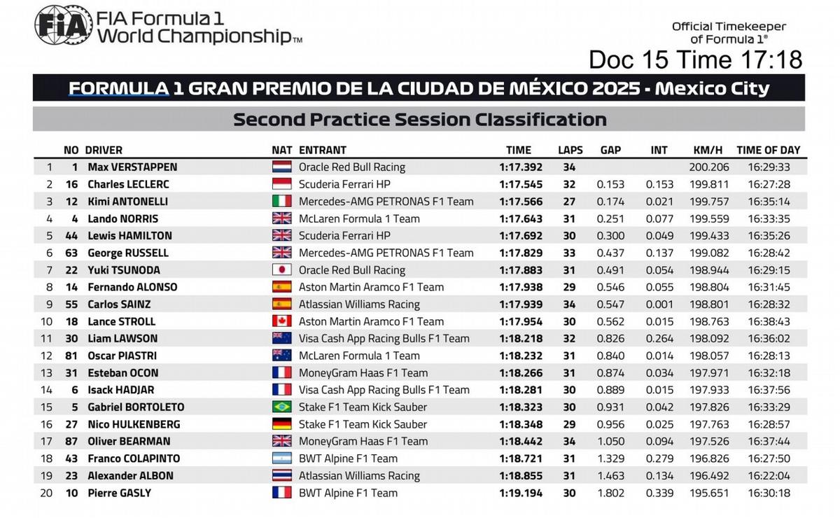 El piloto de Red Bull, Max Verstappen, marcó el ritmo durante la segunda práctica del Gran Premio de la Ciudad de México de Fórmula 1. El holandés lideró la sesión postergando a Charles Leclerc de Ferrari y al Mercedes de Kimi Antonelli. El argentino Franco Colapinto solo pudo conseguir un 18° puesto con un Alpine que no progresó desde la FP1 en la que había resultado 9°.