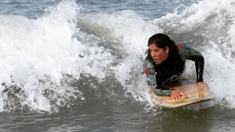 Georgina Melatini, bicampeona sudamericana y latinoamericana de surf adaptado, enseña este deporte a personas con discapacidad en su escuela Santasurf, promoviendo la conexión con el mar.