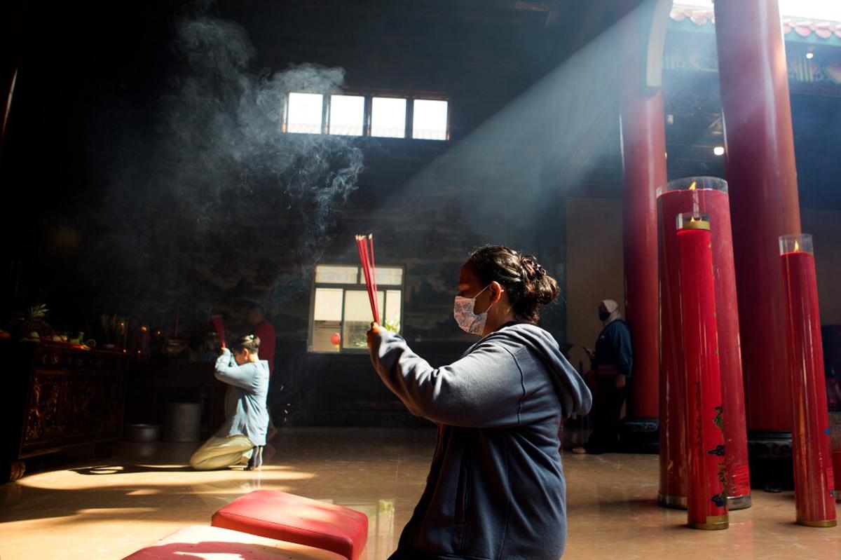 Con varillas de incienso en mano, muchos inclinaban la cabeza repetidamente antes de clavar las varillas en recipientes dispuestos frente al salón del templo.