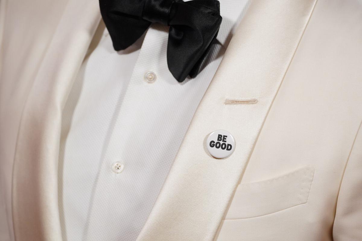 Los pines en blanco y negro mostraban lemas como "BE GOOD" (sean buenos) e "ICE OUT" (fuera ICE), introduciendo un ángulo político en la premiación después de la ceremonia relativamente apolítica del año pasado.