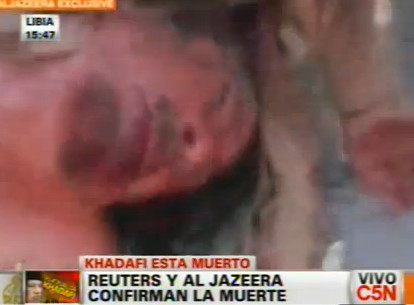 Un video difundido por canales de TV árabes mostró a un gran grupo de combatientes del CNT empujando, golpeando e insultando a Kaddafi, que estaba con su rostro y su camisa ensangrentadas.