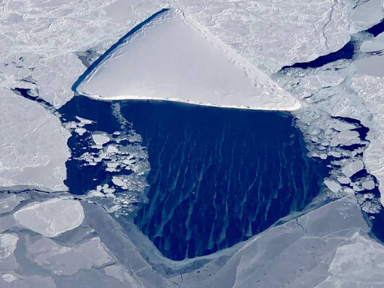 La formación de unos tres kilómetros cuadrados fue hallada en la Península Antártica, en una zona cercana a la plataforma Larsen C. Los investigadores fotografiaron el fenómeno y lo compartieron en la cuenta de Twitter de la Nasa Hielo.