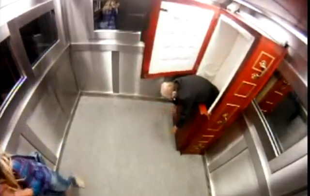 Se trata del mismo elevador, pero en vez de la pequeña muerta-viva, entra en escena un ataúd con un cadáver un poco inquieto. La broma forma parte de un programa humorístico de Brasil.