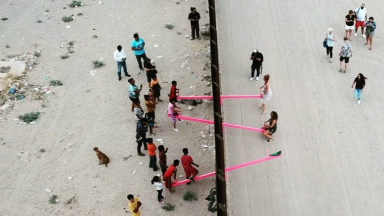 Los tres subibajas rosados fueron inaugurados el lunes en una cerca fronteriza que separa Sunland Park, en Nuevo México, y Ciudad Juárez, en México, permitiendo que niños y adultos de ambos lados jueguen juntos.