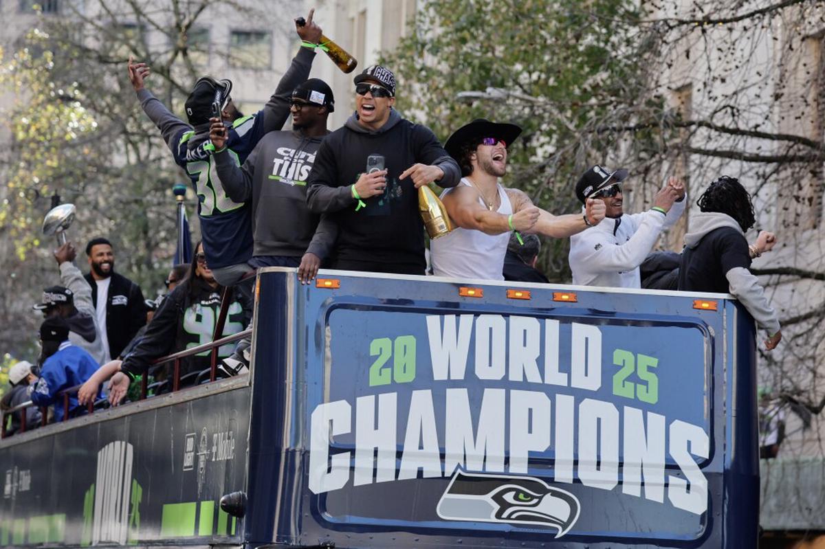 Ernest Jones IV y otros jugadores de los Seahawks rinden homenaje a su equipo tras vencer a los Patriots en el Super Bowl. Un desfile por la ciudad reunió a miles de aficionados.