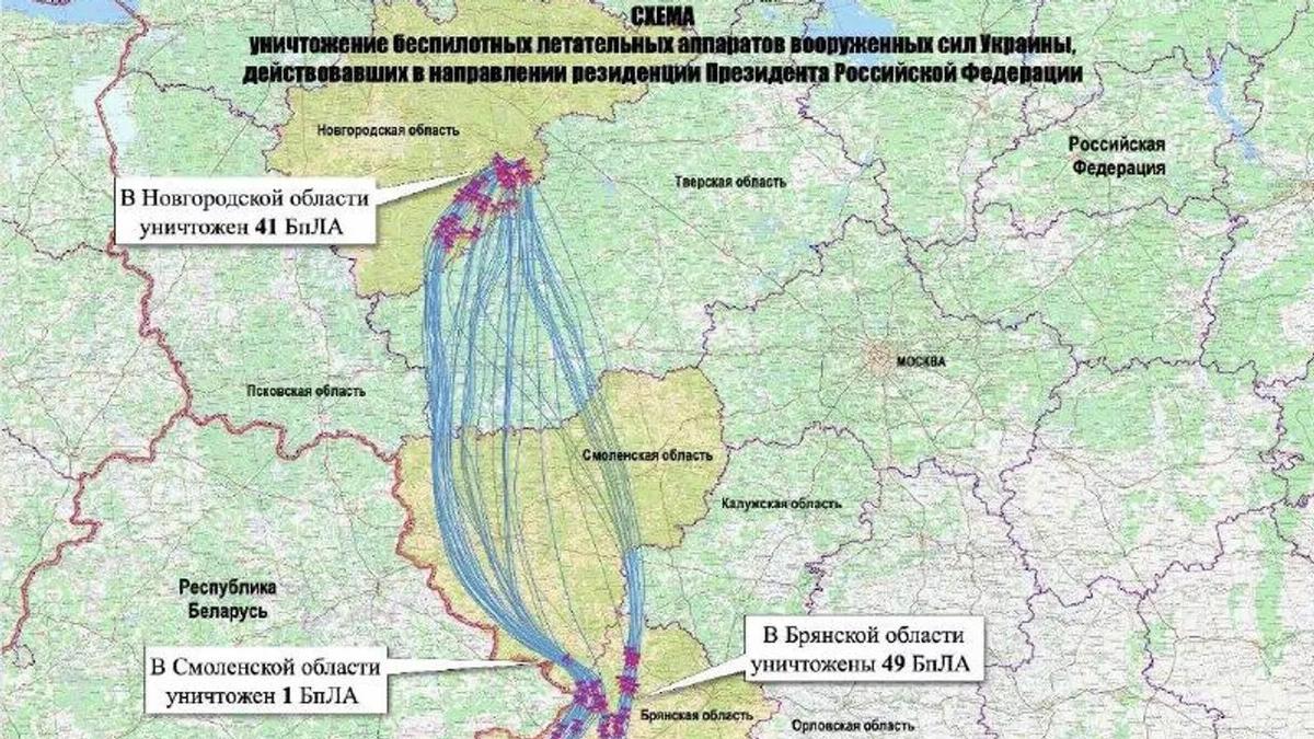 Algunos sobrevolaron las regiones rusas de Bryansk, Smolensk y Tver antes de ser destruidos. El mapa indica que parte de los drones siguió una ruta casi directa hacia el este, mientras que otros tomaron una ruta más larga, volando cerca de la frontera entre Rusia y Bielorrusia a través de las regiones de Bryansk y Smolensk y posteriormente cerca de la frontera entre las regiones de Tver y Pskov.