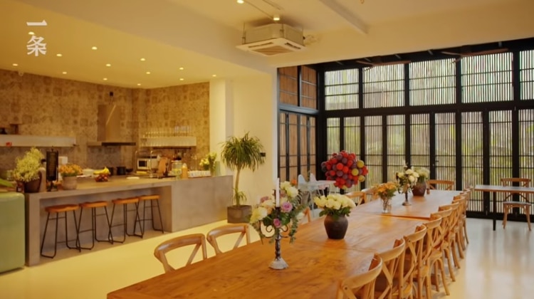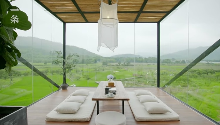 El edificio tienes tres pisos. La primera planta cuenta con una sala de estar donde leen y charlan antes de irse a dormir. Desde la cocina rústica, pueden preparar sus mejores recetas mientras disfrutan de las vistas de los campos de arroz. Una extensa mesa cruza el comedor, con sillas suficientes para albergar a toda la familia.