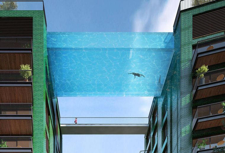 La Sky Pool está ubicada a diez pisos de altura en Londres. Es transparente y une 2 torres de 35 metros en un exclusivo barrio de esa ciudad. Fue colocada con una de las grúas más grandes del planeta.