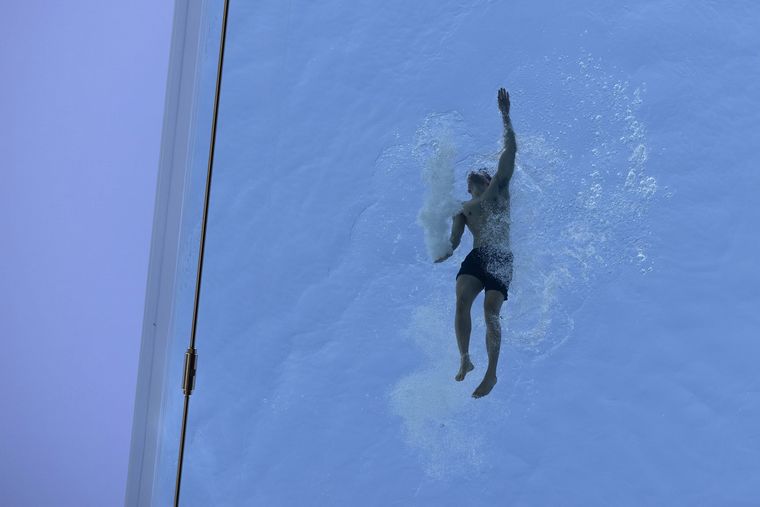 La pileta tiene 48 metros de largo y fue llenada por 148 mil litros de agua. Compite con la que está en Marina Bay Sands Hotel en Singapur, aunque ésta última no tiene piso transparente.
