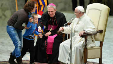Se trata del pequeño Wenzel Eluney, de 7 años, que estaba sentado en la primera fila y escapó de la vista de su madre para llegar junto al Papa.
