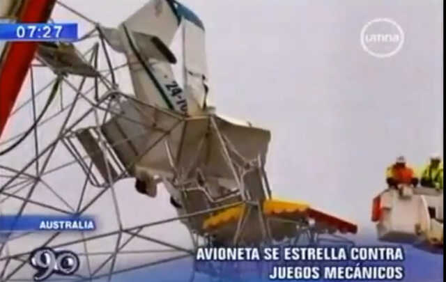 Una avioneta se estrelló contra un juego mecánico llamado “La rueda de la fortuna” y milagrosamente no causó heridos de gravedad en un episodio registrado en Australia.