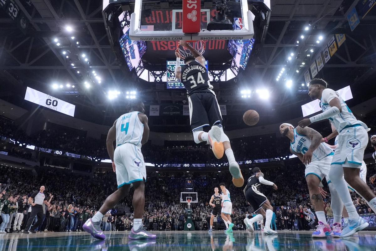 Los Bucks vencieron a los Hornets 122-121 gracias a una volcada de Antetokounmpo en los últimos segundos.