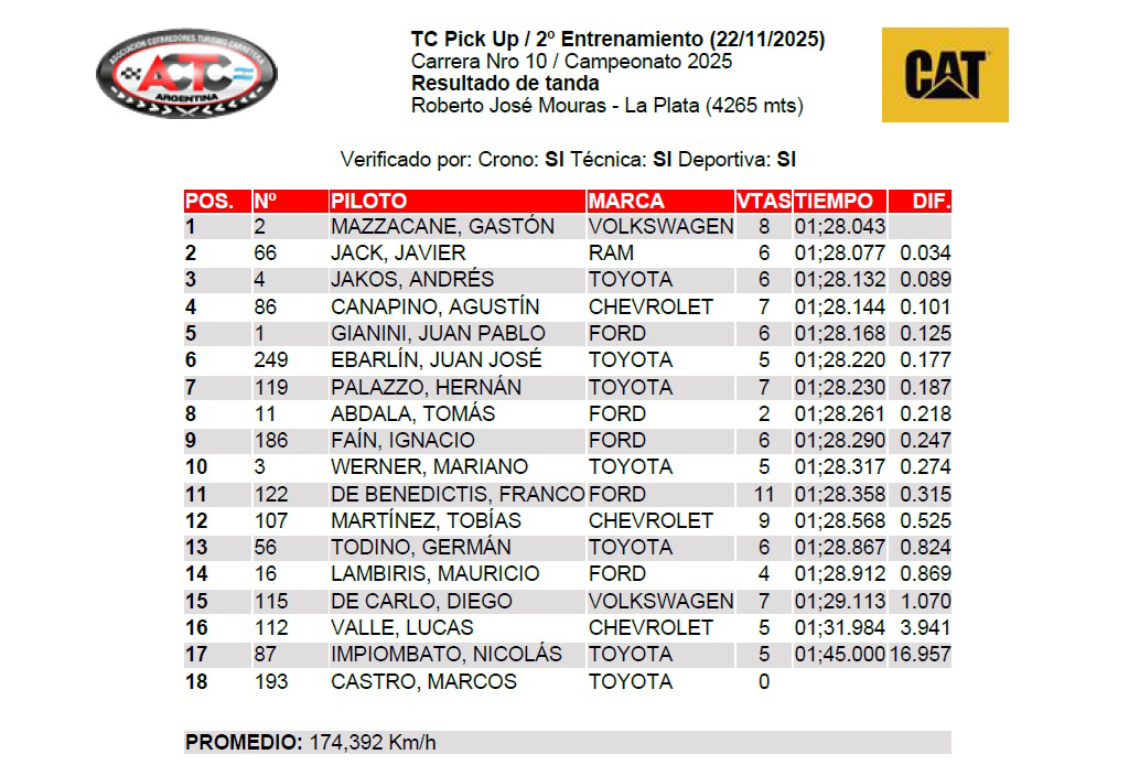Cabe destacar que el tiempo de Gianini en el “Entrenamiento 1” fue 374/1000 mas rápido que el logrado por Mazzacane en el “ET2”. Desde las 16:48 será la úndécima clasificación de la temporada de TC Pick Up.