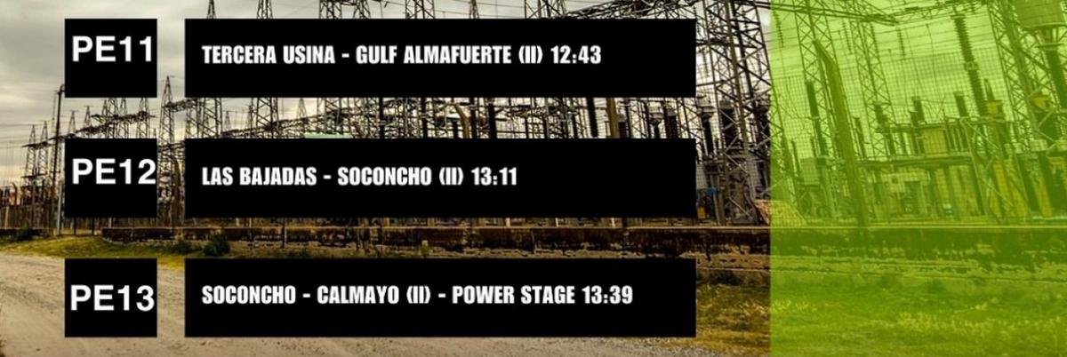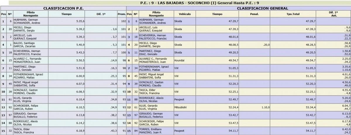En la PE9 Las Bajadas-Soconcho -9.5 kms.-, Hubmann volvió a ser el más rápido y detrás suyo quedaron Miceli y Arceluz. En tanto, Echeverría continuaba despegándose del fuerte ritmo de los punteros.