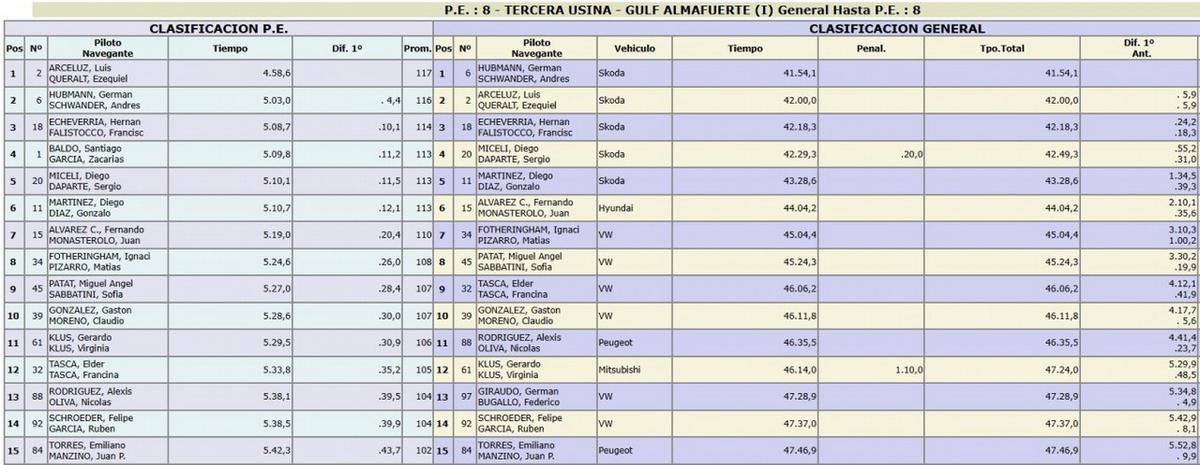 Así, en la PE8 Tercera Usina-Almafuerte -10 kms.-, Arceluz arrancó su embate sobre el puntero del sábado, dejándolo segundos, mientras Echeverría comenzaba a despegarse de la lucha y Baldo -reenganchado- no conseguía el ritmo para su objetivo de ganar un parcial el domingo.