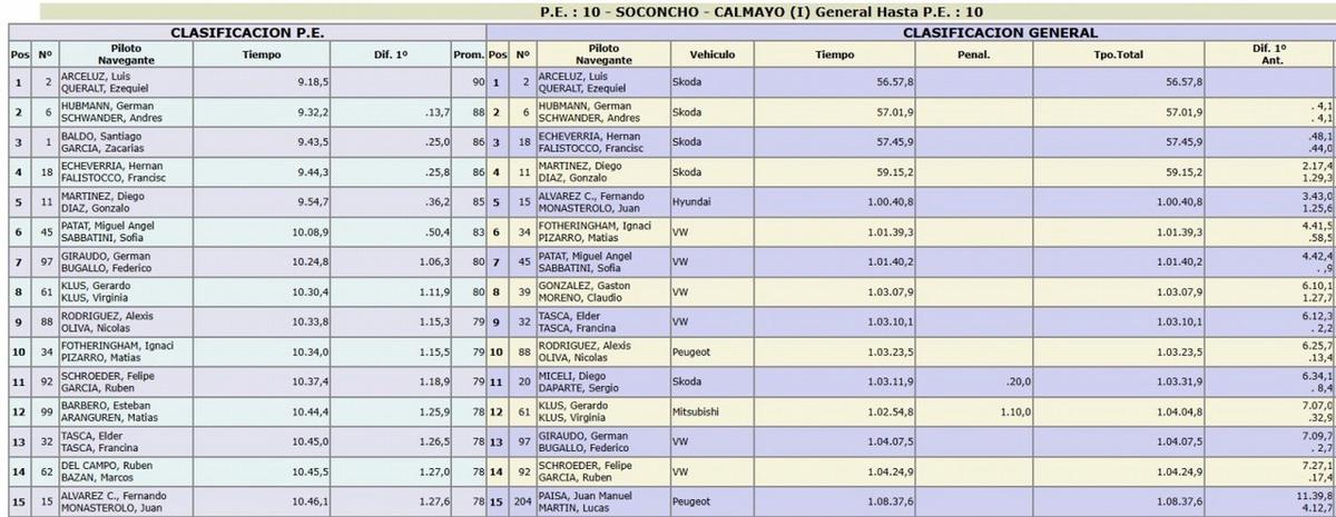 Para la PE10 Soconcho-Calmayo -14 kms.-, el cierre de la primera vuelta, Arceluz se extremó a fondo, en pos de establecer una diferencia. Que consiguió para ser el tercer puntero de este rally al finalizar esta prueba, en la que Hubmann calculó los riesgos y privilegió el plan de cerrar el campeonato en esta fecha. Miceli rompió la trasera derecha a los 5 kms. y resignó más de 5' minutos en el parcial.