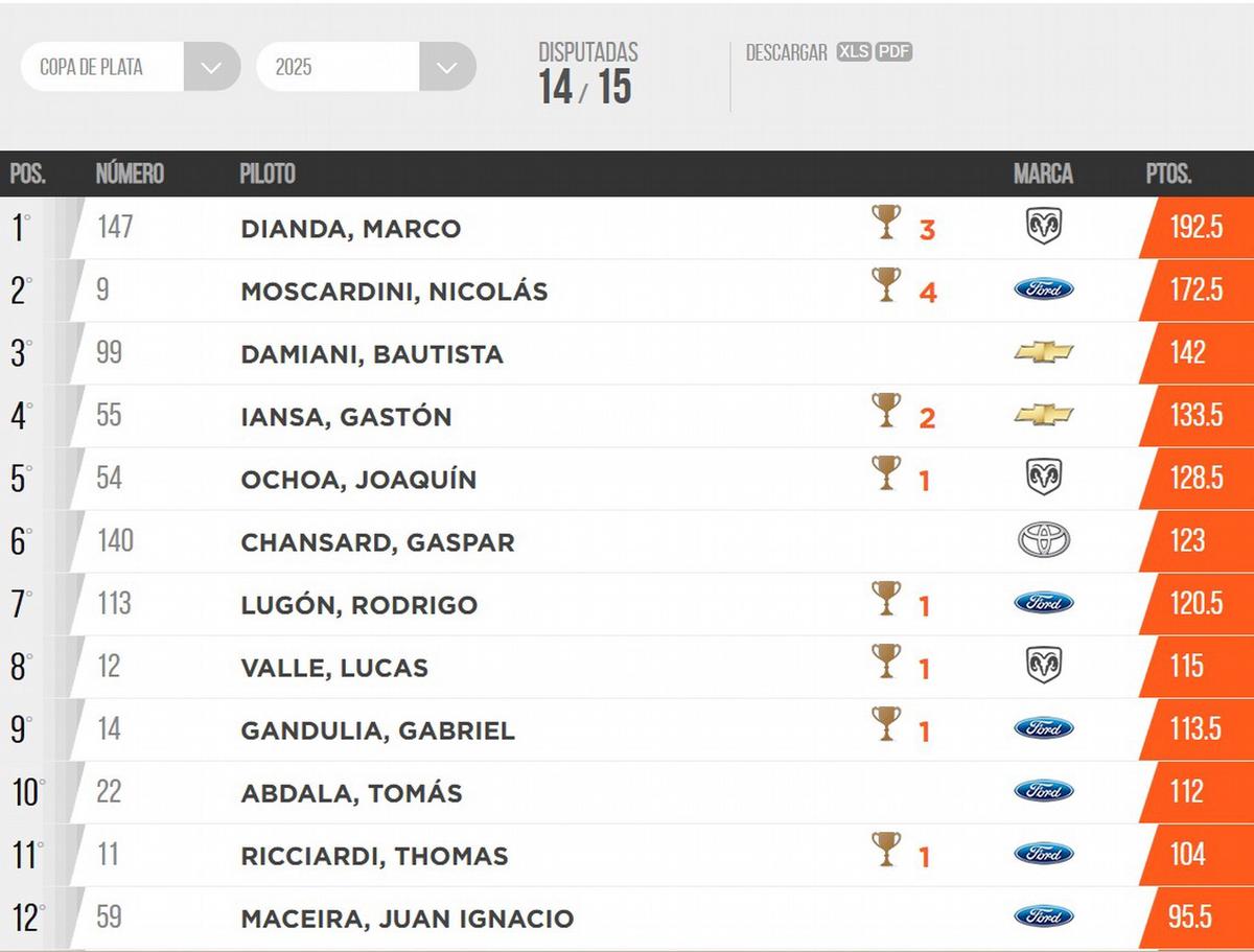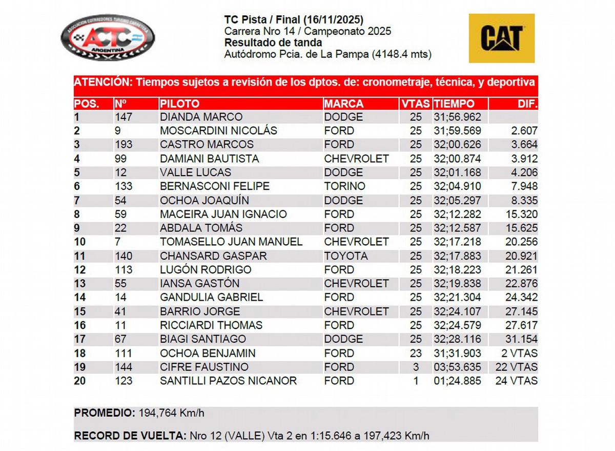 En un día soleado y con la presencia de un enorme marco de público, el cordobés de 17 años, Marco Dianda, venció en la final del TC Pista, que como es habitual acompaña al Turismo Carretera en el Autódromo 'Provincia de La Pampa' -4.148 mts.-, en su penúltima presentación de la temporada. El piloto cordobés de Guatimozín logró su victoria de la temporada y tomó 20 puntos de distancia con su escolta en la 'Copa de Plata', Nicilás Moscardini, que fue también su escolta en la pista.