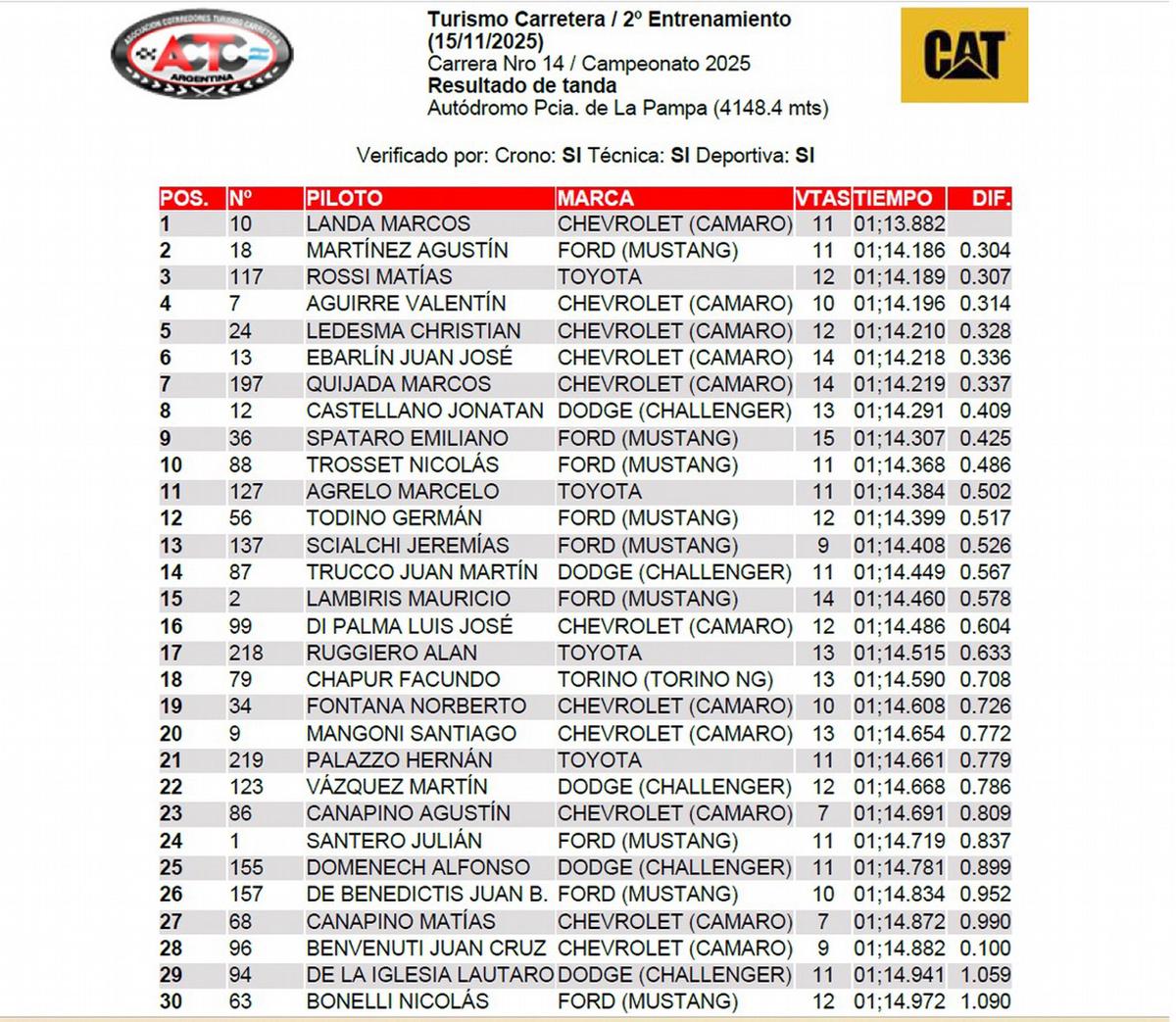 El uruguayo Marcos Landa con Chevrolet Camaro fue el más rápido del 2° Entrenamiento del Turismo Carretera en el Autódromo 'Provincia de La Pampa' -4.148 mts.- de Toay, donde este fin de semana disputa la 14ª Fecha del calendario, que además es la 4ª Fecha de la 'Copa de Oro 2025'.