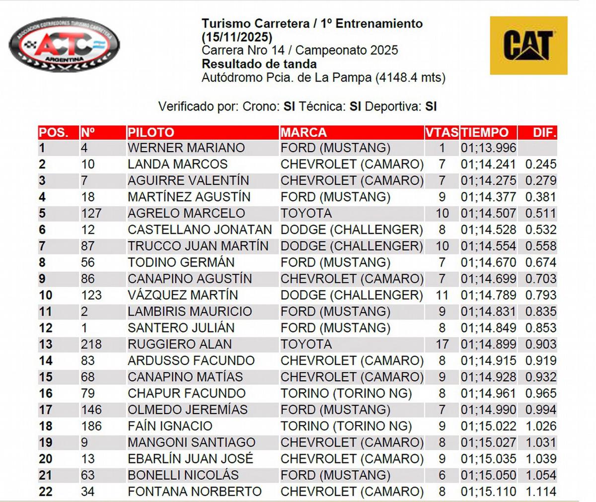 Mariano Werner y su Ford Mustang blanco fueron los líderes del 1° Entrenamiento del Turismo Carretera en el Autódromo 'Provincia de La Pampa' -4.148 mts.- de Toay, donde este fin de semana disputa la 14ª Fecha del calendario y la 4ª Fecha de la 'Copa de Oro 2025' que decide el campeón de la temporada.
