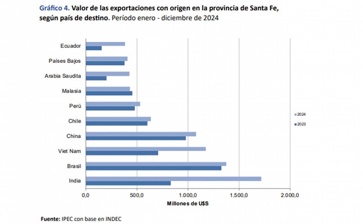 Las exportaciones de la provincia de Santa Fe superaron los US$ 14.700 millones en 2024, impulsadas principalmente por India y Brasil.