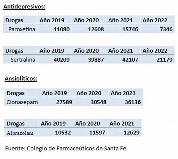 En lo referente a los ansiolíticos, el aumento de la prescripción de Clonazepam llegó al 30 por ciento entre 2019 al 2020, con subas graduales año tras año. Y la venta de Alprazolam tuvo un incremento del 19 por ciento entre los años 2019 y 2021.