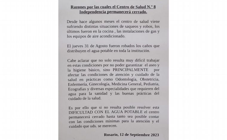 El centro de salud Independencia, de Casiano Casas y Cavia, norte de Rosario, está cerrado desde hace un mes por que a raíz de que les robaron caños, no tienen agua.