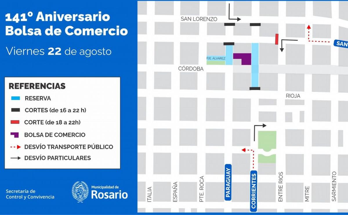 La Municipalidad de Rosario informó que este viernes a la tarde habrá cortes de calles y desvíos de tránsito en el centro de la ciudad debido a los festejos por el 141° aniversario de la Bolsa de Comercio, actividad que contará con la presencia del presidente Javier Milei.