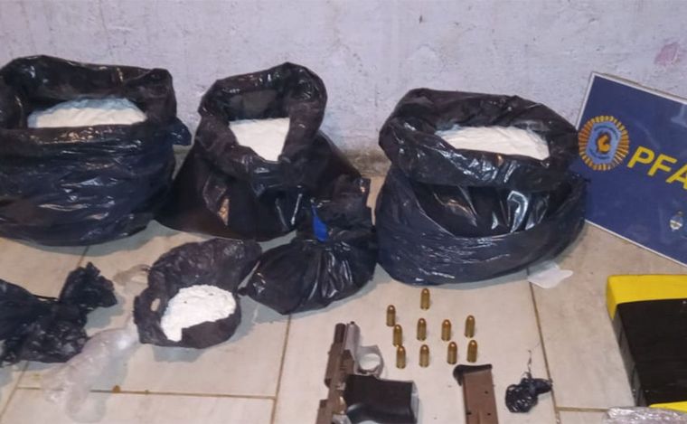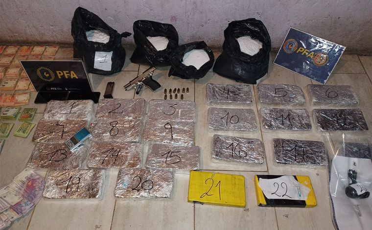 Lo decomisado ronda un peso que supera los 40 Kilogramos, en su mayoría en su clásica presentación de ladrillos; 20 Kilos de sustancia de corte; armas de grueso calibre como pistolas 9mm y escopetas tácticas con mira telescópica; gran cantidad de munición; más de 1 millón 500 mil pesos; balanzas, precintos; teléfonos celulares; vehículos de alta gama y cuadernos con anotaciones, como también se logró detener a unas 15 personas, entre ellos el hermano del reconocido narco “Pollo” Bassi.