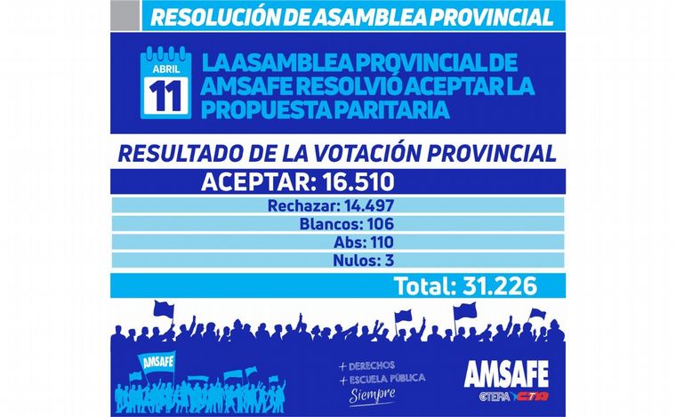 Con una diferencia de dos mil votos aproximadamente, se impuso la moción de la aceptación de la oferta del gobierno provincial en la votación de Amsafe (Asociación del Magisterio de Santa Fe ).