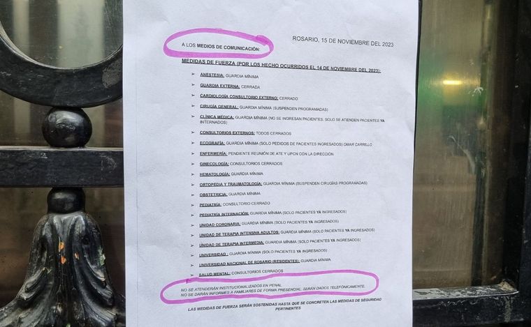 En la puerta del efector se colgaron dos carteles que indican que no se prestarán servicios, a excepción de las atenciones a quienes ya se encuentran internados. Gendarmes resguardan la zona.