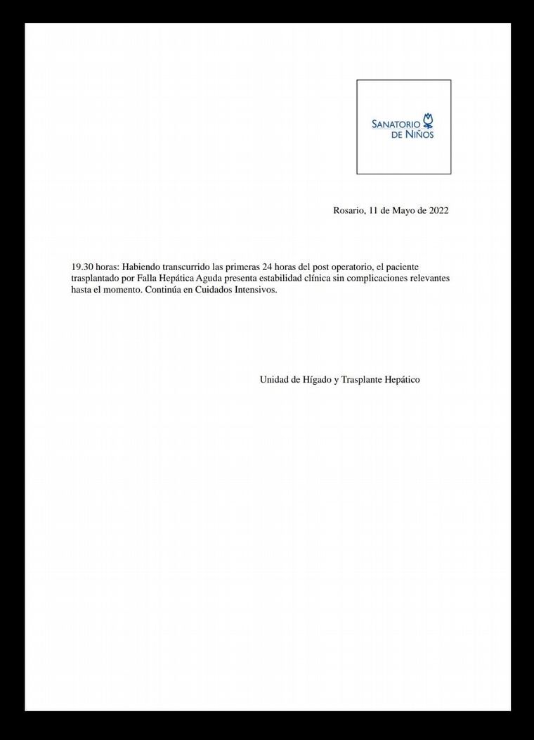 Por la noche, pasadas las 20, el Sanatorio de niños de Rosario emitió un parte en el que destacó que “habiendo transcurrido las primeras 24 horas del post operatorio, el paciente trasplantado presenta estabilidad clínica sin complicaciones”.