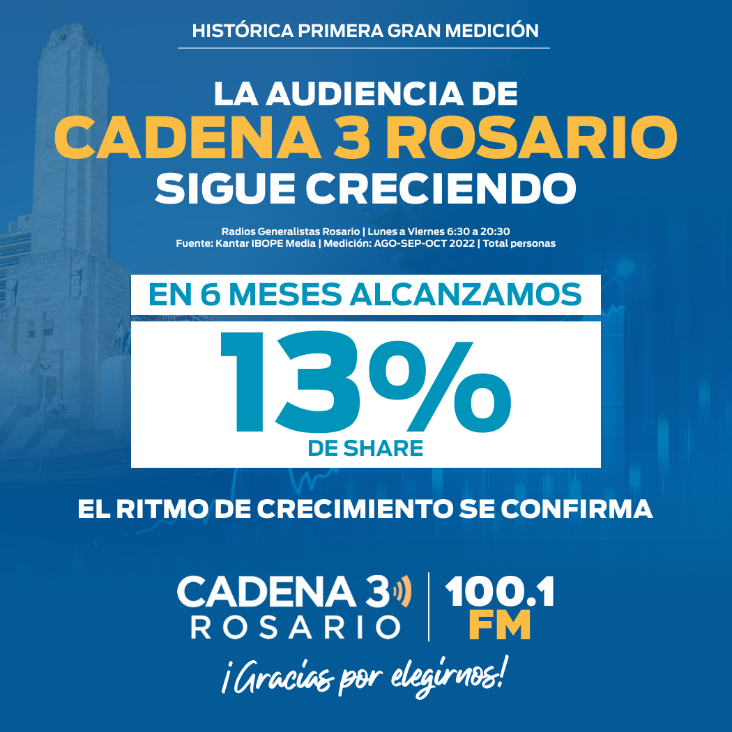 La reciente medición de Kantar Ibope sobre la audiencia de radio en la ciudad muestra que, en apenas 6 meses desde su nacimiento, Cadena 3 Rosario ya se posicionó como la tercera radio generalista más escuchada.