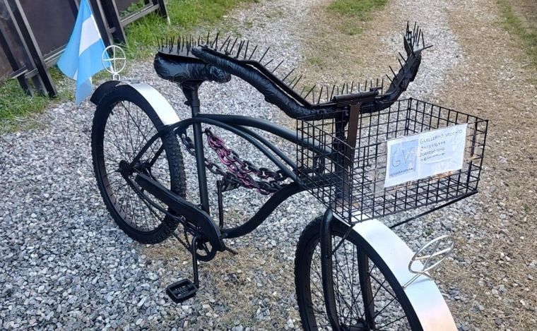 En su taller de herrería, ubicado en Dorrego al 4000, diseñó unas planchas con clavos, que colocó con una estructura rebatible sobre el asiento y el manubrio de la bici.