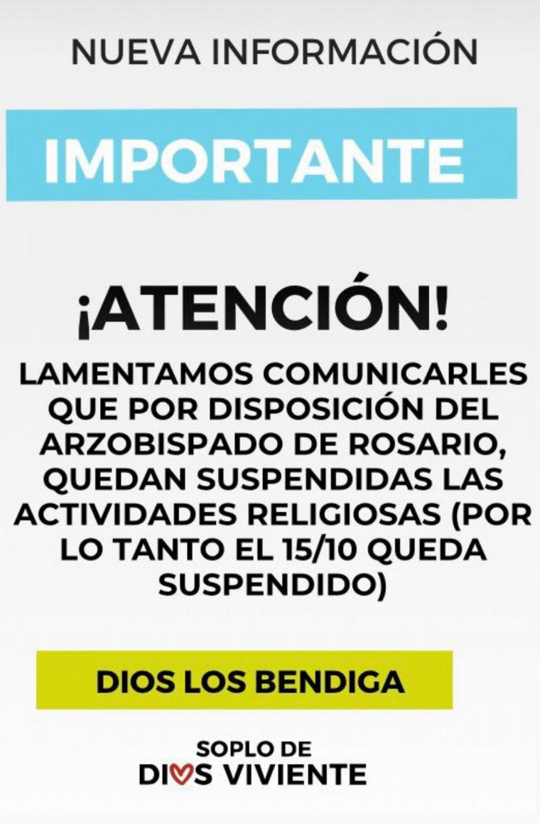 En un comunicado, el Arzobispado de Rosario anunció la suspensión de cualquier actividad pastoral junto a la figura de Leda y su grupo, Soplo de Dios, desde donde confirmaron que se canceló por este motivo el próximo encuentro estipulado para el 15 de octubre