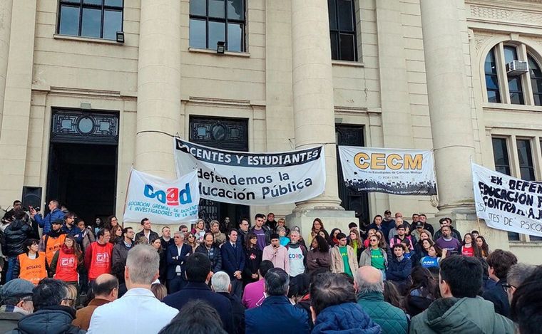Los dos fueron el centro de un abrazo solidario del que además del rector participaron diversos Centros de Estudiantes de la UNR y el gremio COAD en representación de los docentes universitarios.