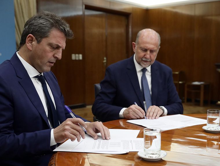 El gobernador de Santa Fe, Omar Perotti, y el ministro de Economía de la Nación, Sergio Massa, firmaron este lunes el acta de entrega de títulos públicos que conforman el cumplimiento de la sentencia de pago de la deuda histórica que el Estado federal mantiene con la provincia por un total de 151.873 millones de pesos.