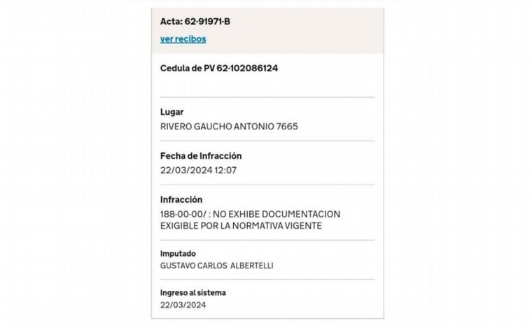 La infracción de tránsito atribuida a Albertelli es en Rivero al 7600, zona oeste de Rosario, el 22 de marzo al mediodía. El motivo: circular sin la documentación necesaria.